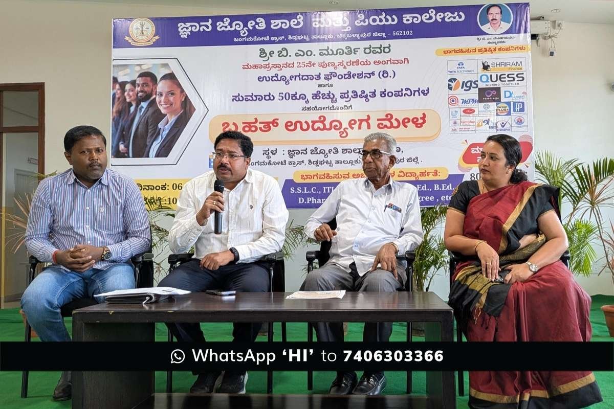 Sidlaghatta, chikkaballapur : ಶಿಡ್ಲಘಟ್ಟ ತಾಲ್ಲೂಕಿನ ಜಂಗಮಕೋಟೆ ಕ್ರಾಸ್ನ ಜ್ಞಾನ ಜ್ಯೋತಿ ಶಾಲಾ ಆವರಣದಲ್ಲಿ ಡಿಸೆಂಬರ್ 6, 2025 (ಶನಿವಾರ) ರಂದು ಬೃಹತ್ ಉದ್ಯೋಗ ಮೇಳ (Mega Job Mela 2025) ಆಯೋಜಿಸಲಾಗಿದೆ. ಈ ಮೇಳವನ್ನು ಗ್ರಾಮೀಣ ವಿದ್ಯಾಭಿವೃದ್ಧಿ ಸಂಸ್ಥೆ (Rural Education Development Trust) ವತಿಯಿಂದ ಹಮ್ಮಿಕೊಳ್ಳಲಾಗಿದ್ದು, ಸ್ಥಳೀಯ ಹಾಗೂ ಗ್ರಾಮೀಣ ಯುವಕರಿಗೆ ಸಾವಿರಾರು ಉದ್ಯೋಗಾವಕಾಶಗಳು ಲಭ್ಯವಾಗಲಿವೆ.